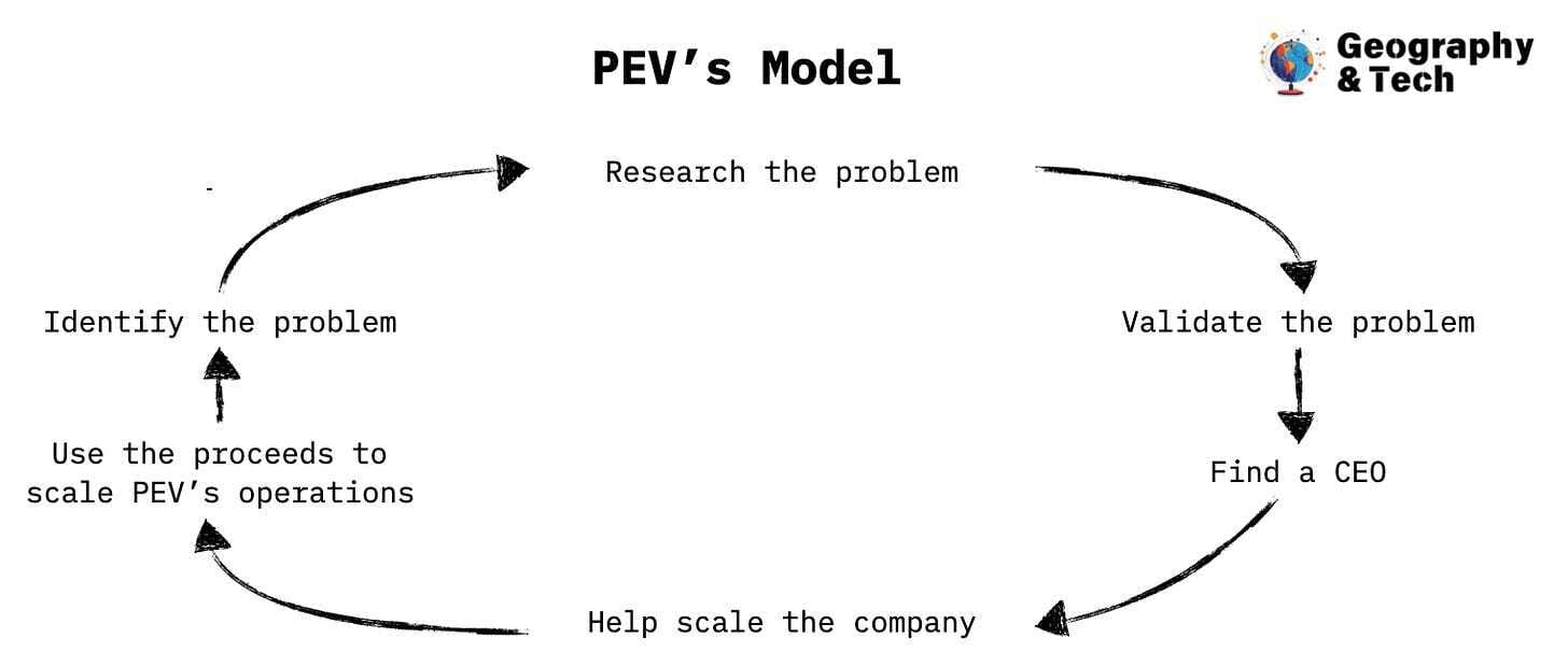 When PEV hires a CEO for a business, that CEO gets equity in the company. The CEO then finances operations of the business through revenue, external funding, or debt from PEV. PEV profits through dividends or by selling its stake.
